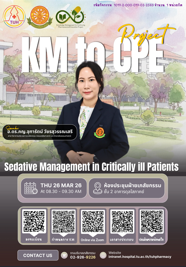 20 Mar Knowledge Management to Continuing Pharmaceutical Education หัวข้อ Sedative Management in Critically ill Patients จัดวันที่ 26 มี.ค. 2569 ห้องประชุมฝ่ายเภสัชกรรม ชั้น 2 อาคารดุลโสภาคย์ รพ.ธรรมศาสตร์เฉลิมพระเกียรติ และรูปแบบออนไลน์ โดย ฝ่ายเภสัชกรรม โรงพยาบาลธรรมศาสตร์เฉลิมพระเกียรติ อ่านต่อ