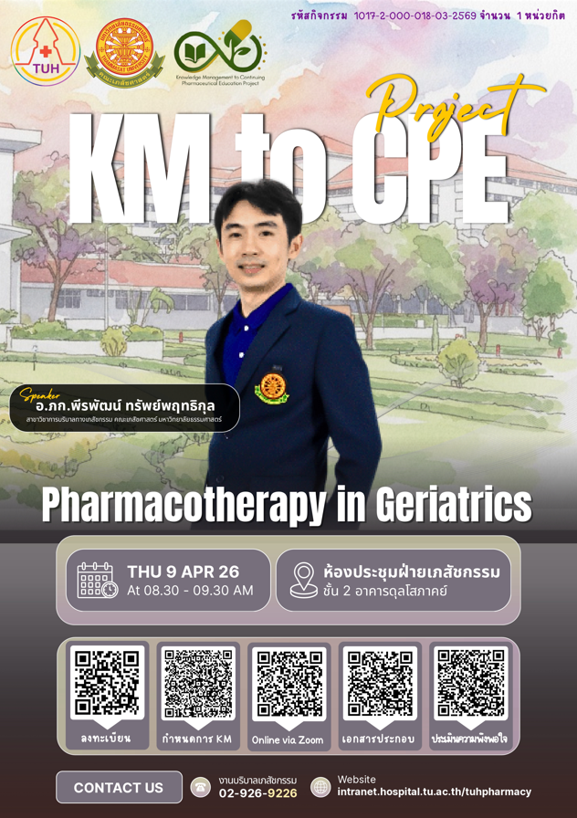 03 Apr Knowledge Management to Continuing Pharmaceutical Education หัวข้อ Pharmacotherapy in Geriatrics จัดวันที่ 09 เม.ย. 2569 ณ ห้องประชุมฝ่ายเภสัชกรรม ชั้น 2 อาคารดุลโสภาคย์ รพ.ธรรมศาสตร์เฉลิมพระเกียรติ และรูปแบบออนไลน์ อ่านต่อ