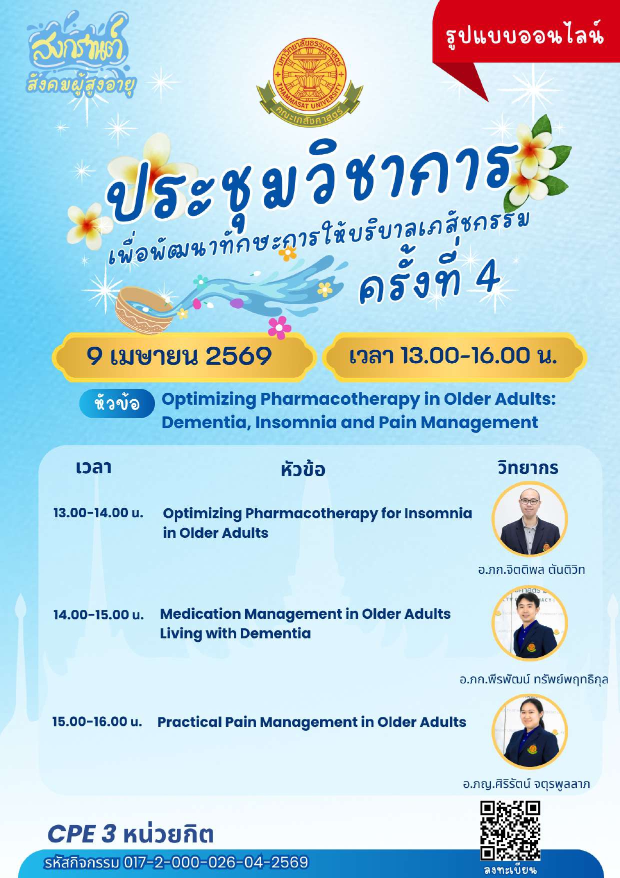 03 Apr (Online) ประชุมวิชาการเพื่อพัฒนาทักษะการให้บริบาลเภสัชกรรม หัวข้อ Optimizing Pharmacotherapy in Older Adults: Dementia, Insomnia and Pain Management จัดวันที่ 09 เม.ย. 2569 โดย สาขาวิชาการบริบาลทางเภสัชกรรม คณะเภสัชศาสตร์ มหาวิทยาลัยธรรมศาสตร์ รูปแบบออนไลน์ อ่านต่อ