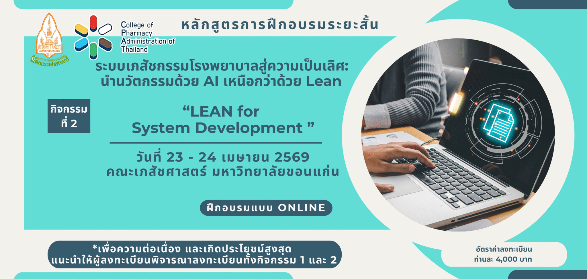 03 Apr (Online) หลักสูตรฝึกอบรมระยะสั้น กิจกรรมที่ 2 LEAN for System Development (ภายใต้โครงการหลักสูตร ระบบเภสัชกรรมโรงพยาบาลสู่ความเป็นเลิศ: นำนวัตกรรมด้วย AI เหนือกว่าด้วย Lean) รุ่นที่ 1 (ปี 2569) (ฝึกอบรมแบบ Online 23 -24 เม.ย. 2569 โดย คณะเภสัชศาสตร์ มหาวิทยาลัยขอนแก่น อ่านต่อ