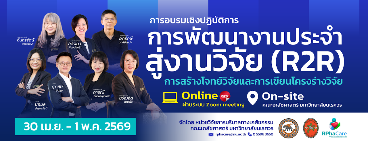 10 Apr โครงการพัฒนางานวิจัยสำหรับเภสัชกรในหัวข้อ “การอบรมเชิงปฏิบัติการ การพัฒนางานประจำสู่งานวิจัย (R2R): การสร้างโจทย์วิจัยและการเขียนโครงร่างวิจัย” จัดวันที่ 30 เม.ย. 2569 - 01 พ.ค. 2569 โดย คณะเภสัชศาสตร์ มหาวิทยาลัยนเรศวร อ่านต่อ