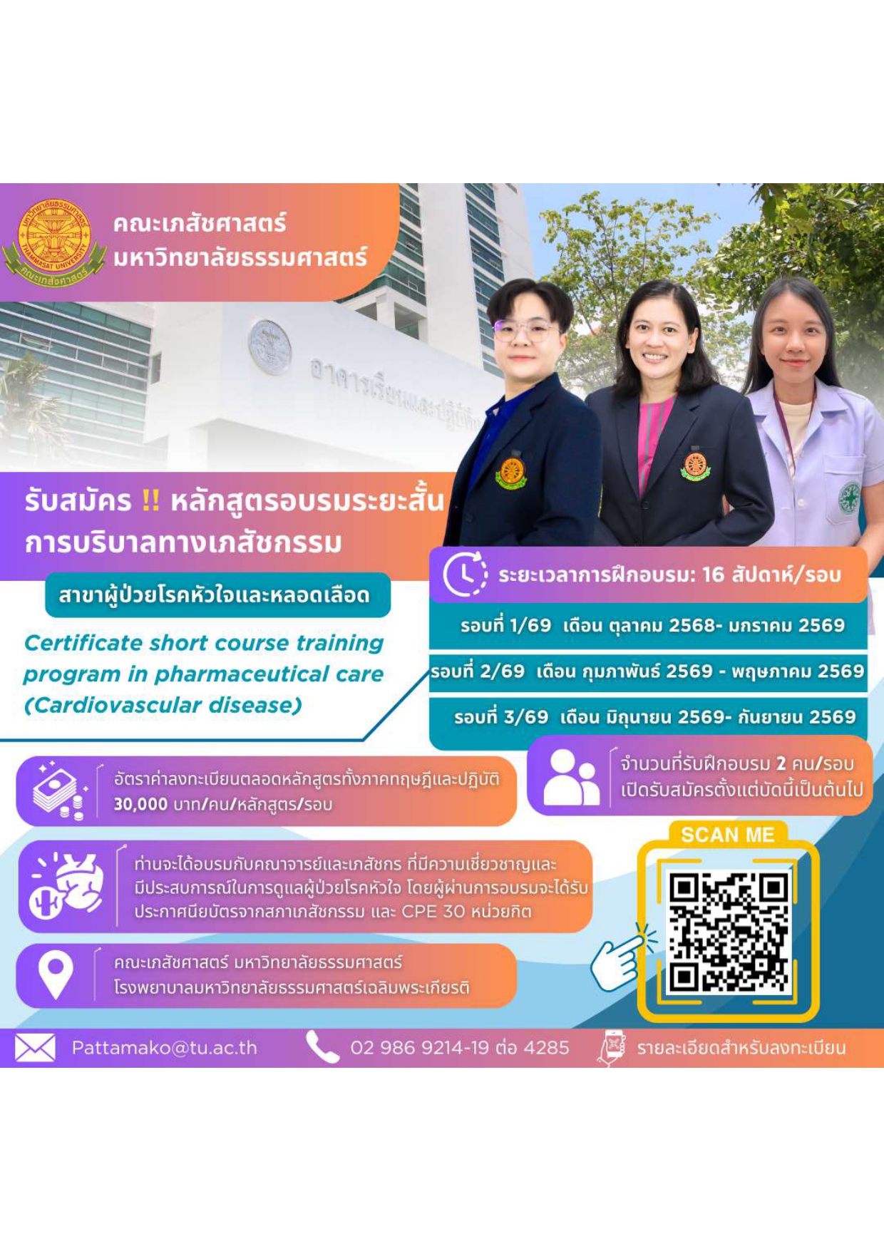 23 Jan หลักสูตรการฝึกอบรมระยะสั้นการบริบาลทางเภสัชกรรม ในหลักสูตรประกาศนียบัตรวิชาชีพเภสัชกรรม (สาขาผู้ป่วยโรคหัวใจและหลอดเลือด) รอบ 2/69 จัดวันที่ 01 ก.พ. 2569 - 31 พ.ค. 2569 1.คณะเภสัชศาสตร์ มหาวิทยาลัยธรรมศาสตร์ 2.หอผู้ป่วยวิกฤตศัลยกรรมหัวใจและทรวงอก 3.หอผู้ป่วยวิกฤตโรคหัวใจ 4.ศูนย์ความเป็นเลิศโรคหัวใจและหลอดเลือด โรงพยาบาลธรรมศาสตร์เฉลิมพระเกียรติ โดย คณะเภสัชศาสตร์ มหาวิทยาลัยธรรมศาสตร์ อ่านต่อ