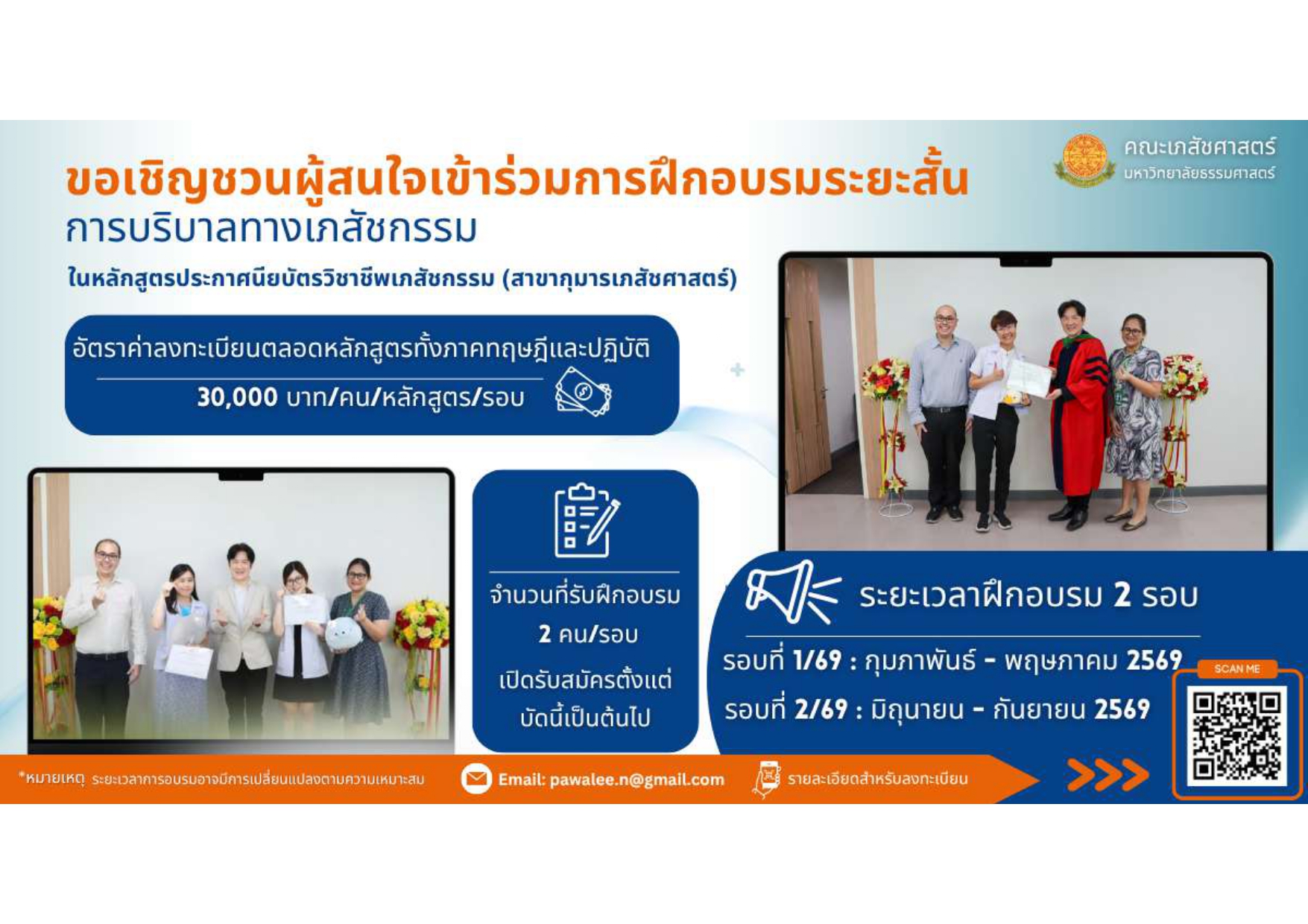 23 Jan หลักสูตรการฝึกอบรมระยะสั้นการบริบาลทางเภสัชกรรม ในหลักสูตรประกาศนียบัตรวิชาชีพเภสัชกรรม (สาขากุมารเภสัชศาสตร์) รอบ 1/69 จัดวันที่ 01 ก.พ. 2569 - 31 พ.ค. 2569 คณะเภสัชศาสตร์ มหาวิทยาลัยธรรมศาสตร์ และ โรงพยาบาลธรรมศาสตร์เฉลิมพระเกียรติ โดย คณะเภสัชศาสตร์ มหาวิทยาลัยธรรมศาสตร์ อ่านต่อ