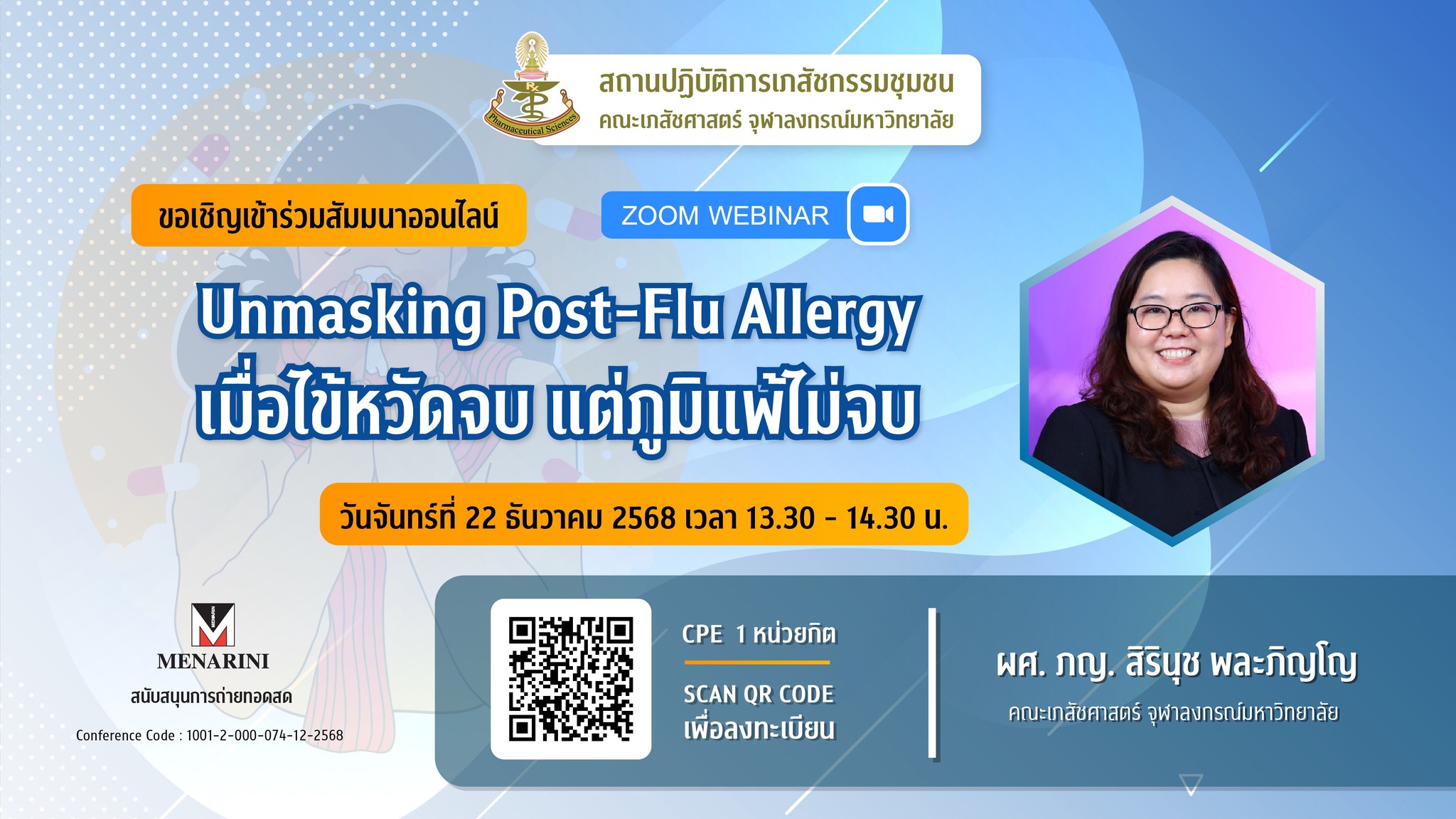 19 Dec (Online)เรื่อง “Unmasking Post-Flu Allergy เมื่อไข้หวัดจบ แต่ภูมิแพ้ไม่จบ” จัดวันที่ 22 ธ.ค. 2568 เวลา 13.30-14.30 น. โดย คณะเภสัชศาสตร์ จุฬาลงกรณ์มหาวิทยาลัย อ่านต่อ