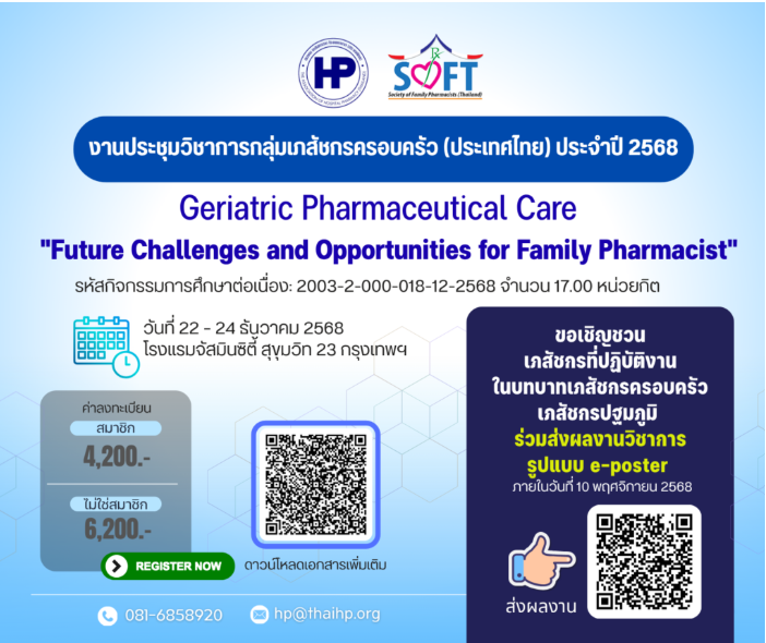 19 Dec งานประชุมวิชาการประจำปี 2568 กลุ่มเภสัชกรครอบครัว สมาคมเภสัชกรรมโรงพยาบาล(ประเทศไทย) Geriatric Pharmaceutical Care "Future Challenges and Opportunities for Family Pharmacist" จัดวันที่ 22 -24 ธ.ค. 2568 ณ ห้องซากุระ โรงแรมจัสมินซิตี้ สุขุมวิท 23 กรุงเทพฯ โดย สมาคมเภสัชกรรมโรงพยาบาล (ประเทศไทย) อ่านต่อ