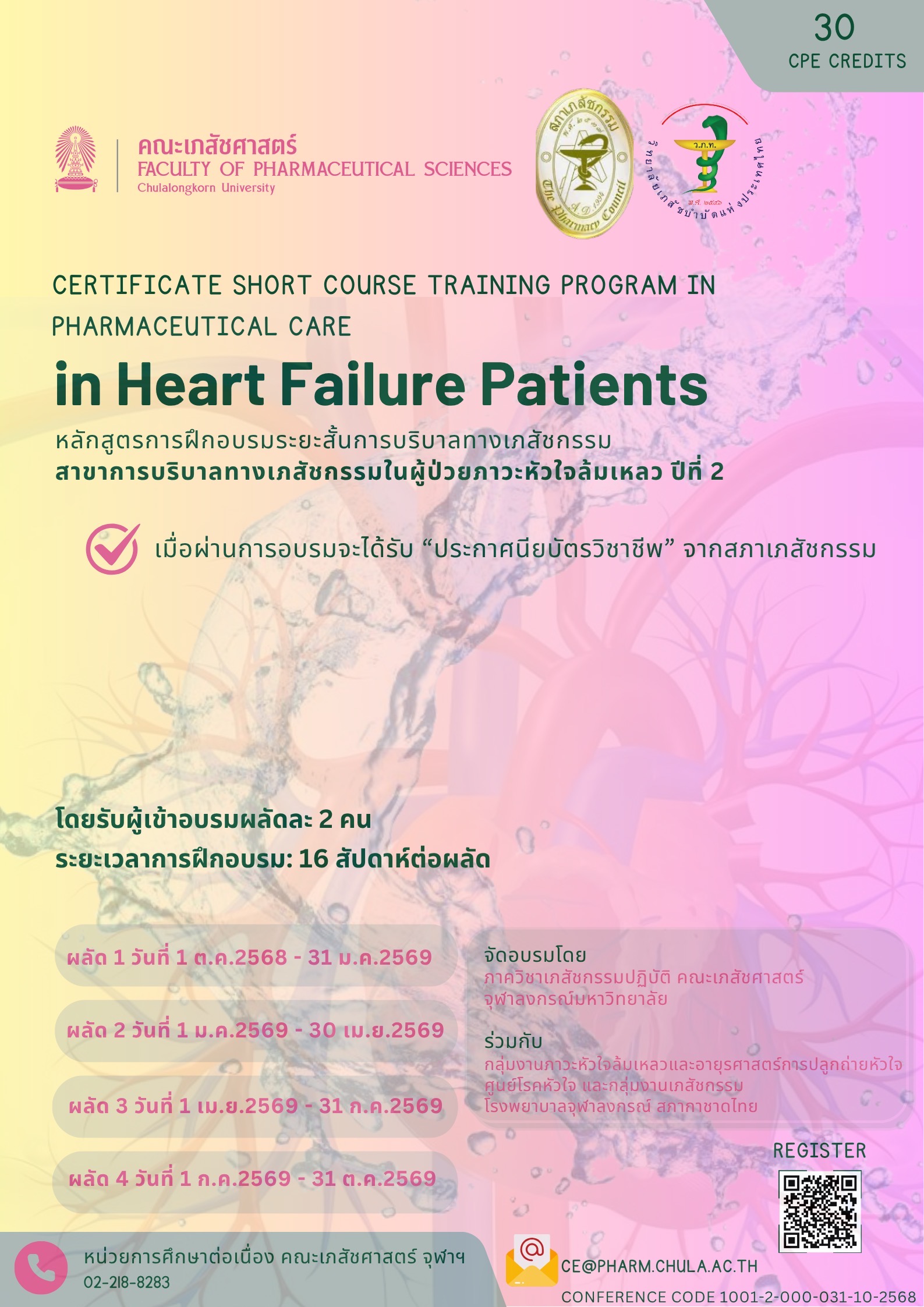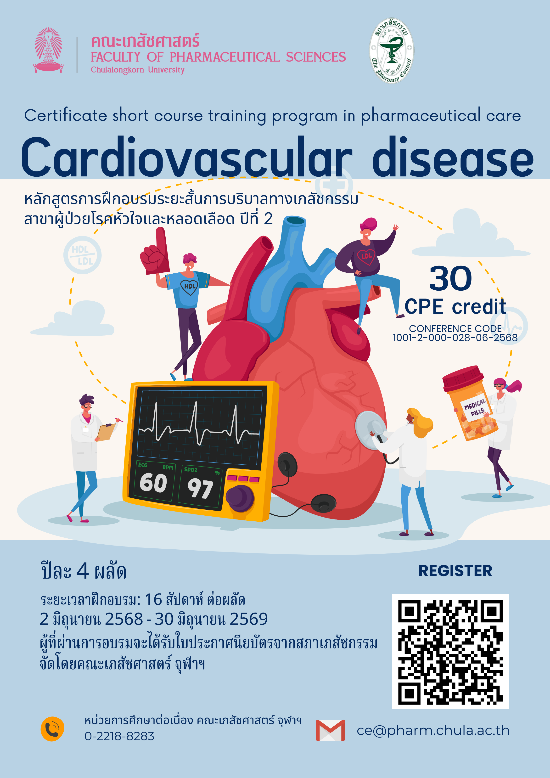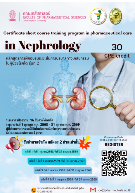 จัดวันที่ 01ต.ค.68 -31 ต.ค. 2569 ณ คณะเภสัชศาสตร์ จุฬาฯ และอาคารภูมิสิริมังคลานุสรณ์ โรงพยาบาลจุฬาลงกรณ์ โดย คณะเภสัชศาสตร์ จุฬาลงกรณ์มหาวิทยาลัย