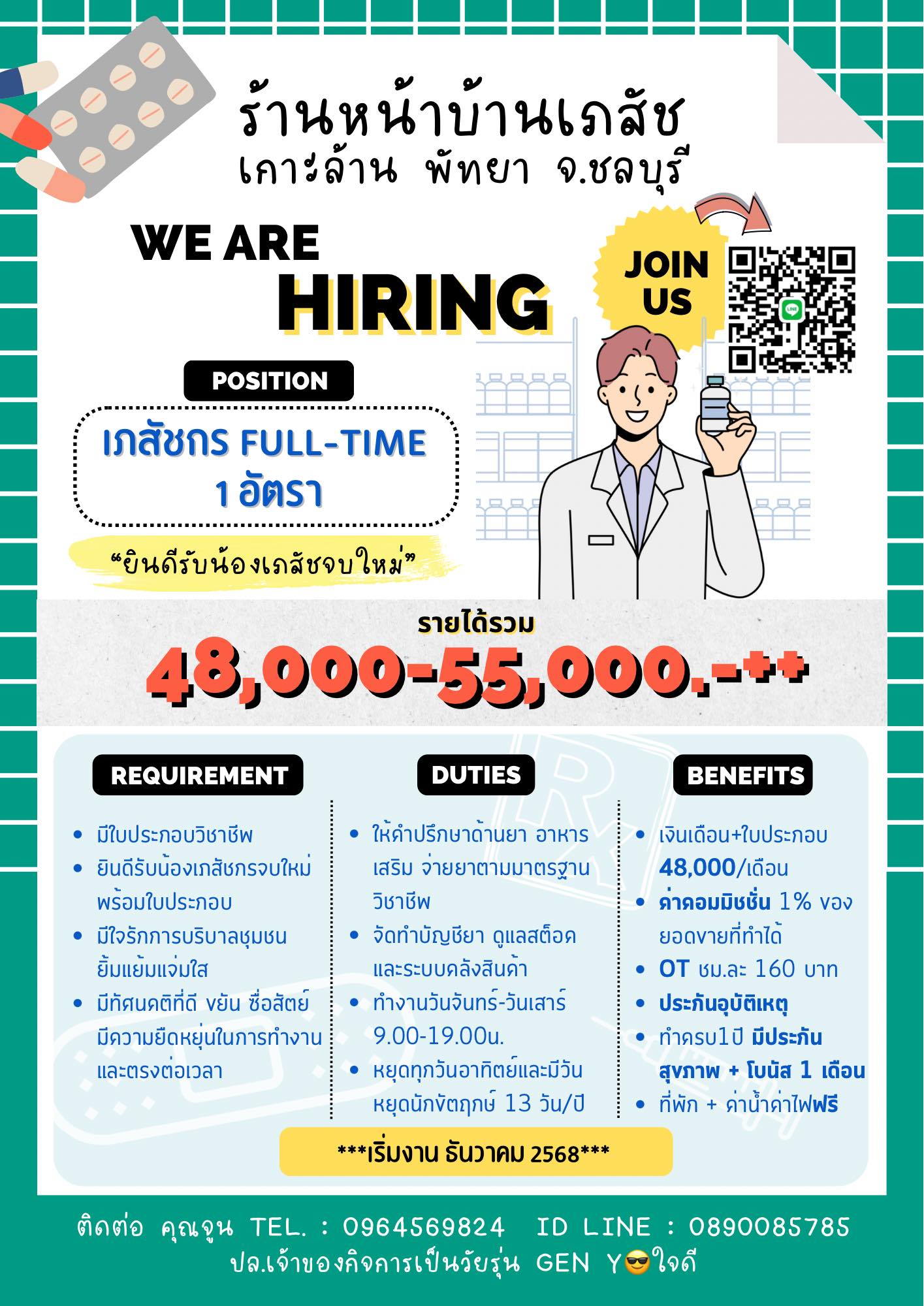 เวลาทำงาน : 9 ชม. รวมพัก (9.00 - 19.00 น.)