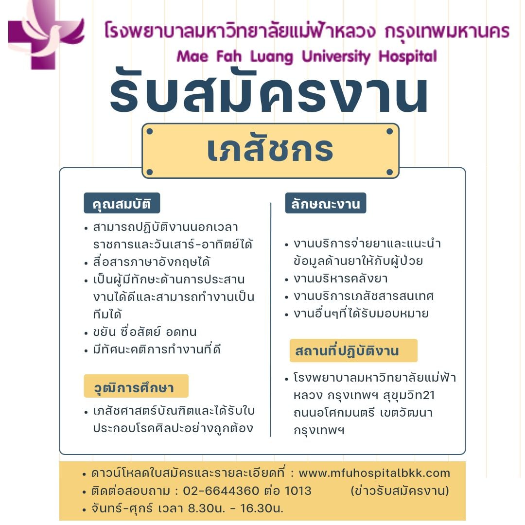 เขตวัฒนา กรุงเทพฯดาวน์โหลดใบสมัครและรายละเอียดที่ : www.mfuhospitalbkk.comติดต่อสอบถาม : 02-6644360 ต่อ 1013 (ข่าวรับสมัครงาน)จันทร์–ศุกร์ เวลา 8.30น. – 16.30น.
