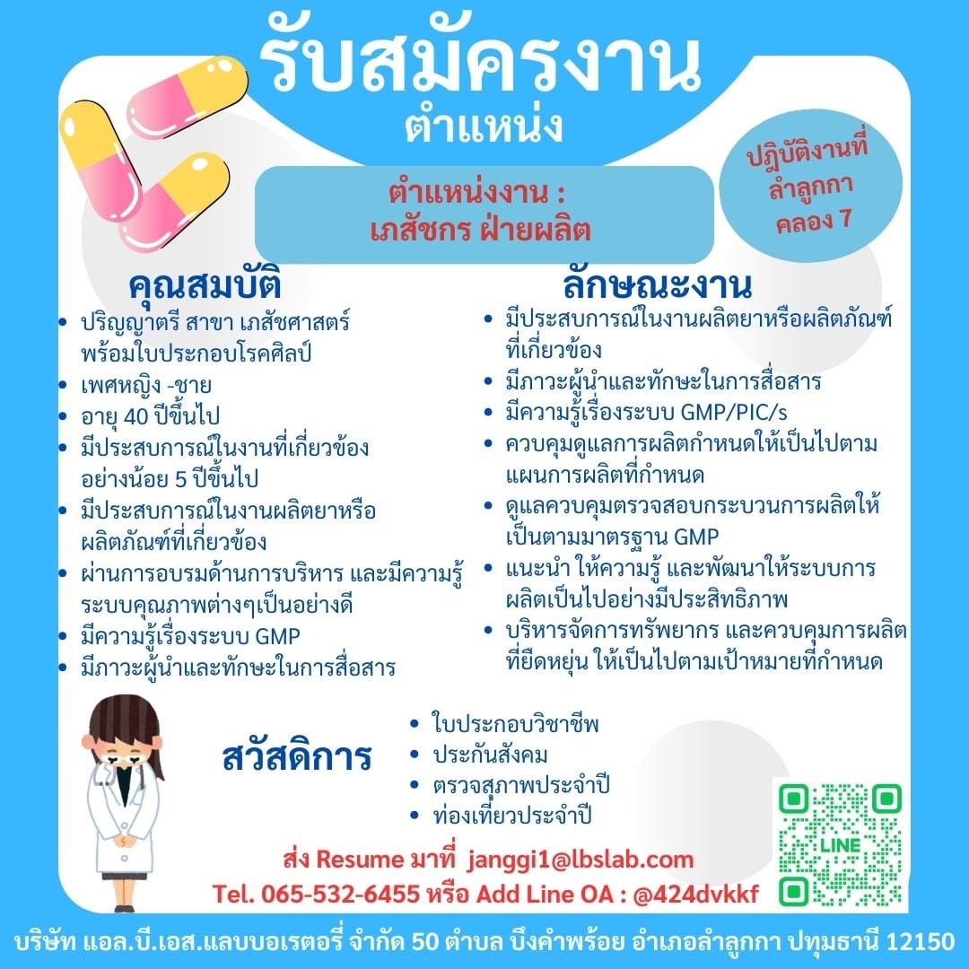 มีประสบการณ์ในงานผลิตยา หรือผลิตภัณฑ์ที่เกี่ยวข้อง