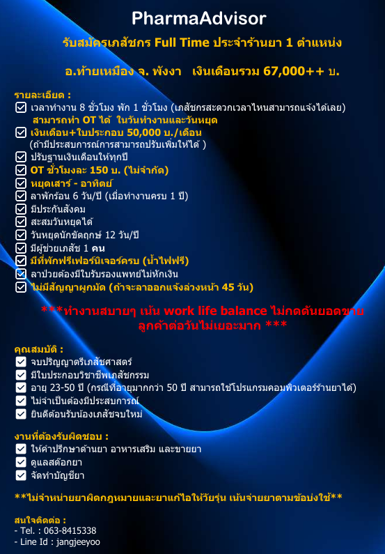 ✅ เวลาทำงาน 8 ชั่วโมง พัก 1 ชั่วโมง (เภสัชกรสะดวกเวลาไหนสามารถแจ้งได้เลย)