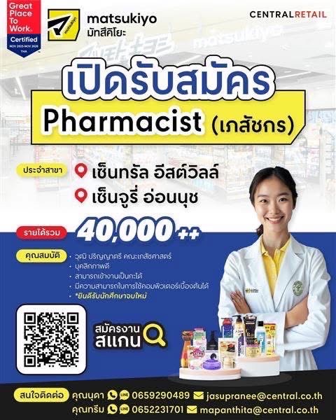 ส่ง Resume มาได้ที่ mail Jasupranee@central.co.th หรือโทร คุณนุดา 065-929-0489