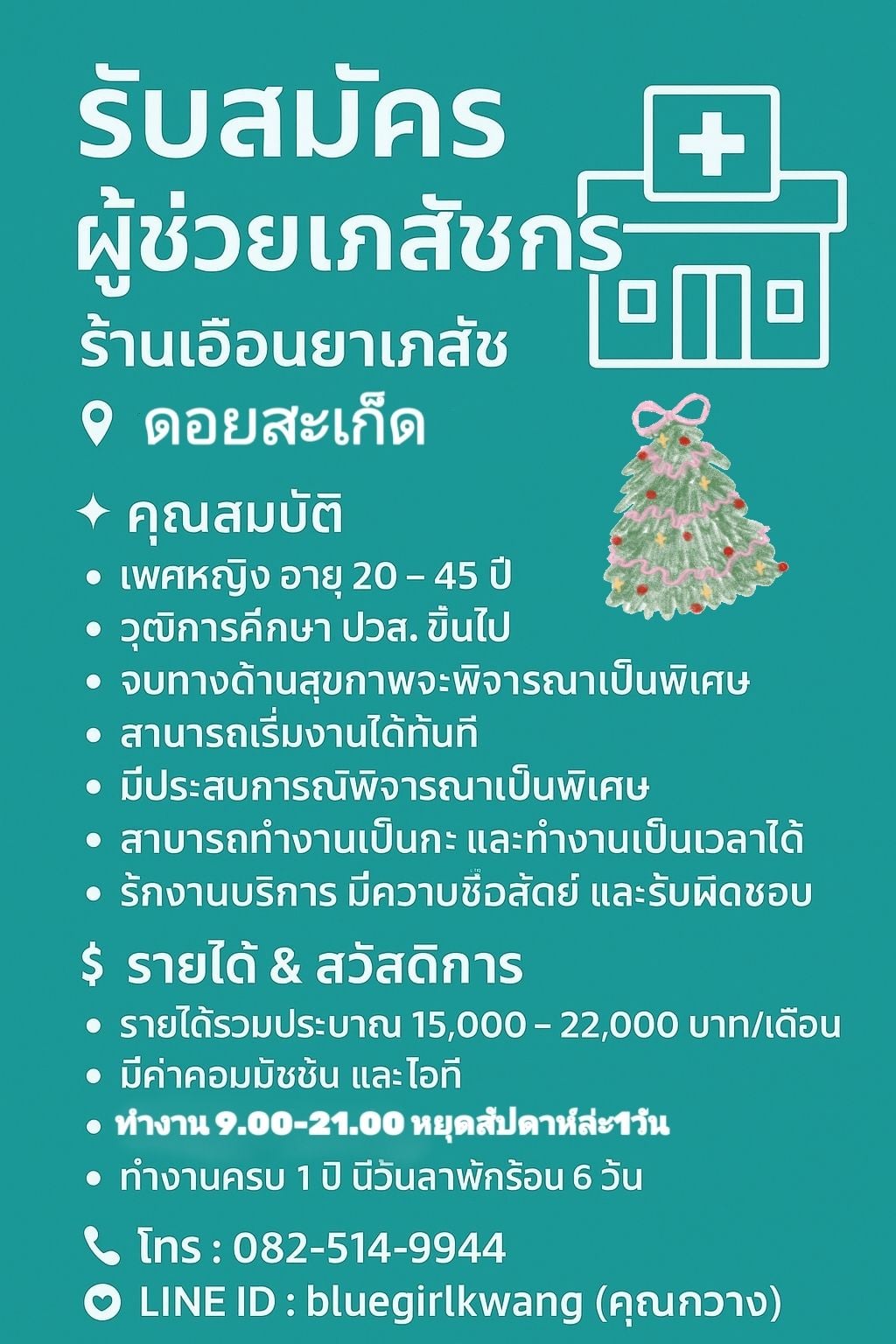 เวลาทำงาน : ทำงาน 9.00 – 21.00 น.