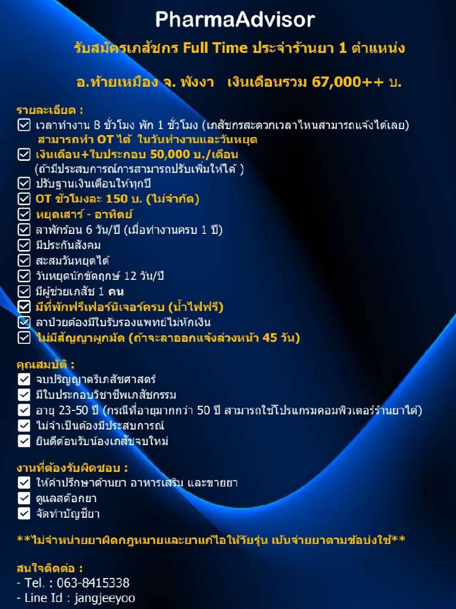 ✅ เวลาทำงาน 8 ชั่วโมง พัก 1 ชั่วโมง (เภสัชกรสะดวกเวลาไหนสามารถแจ้งได้เลย)