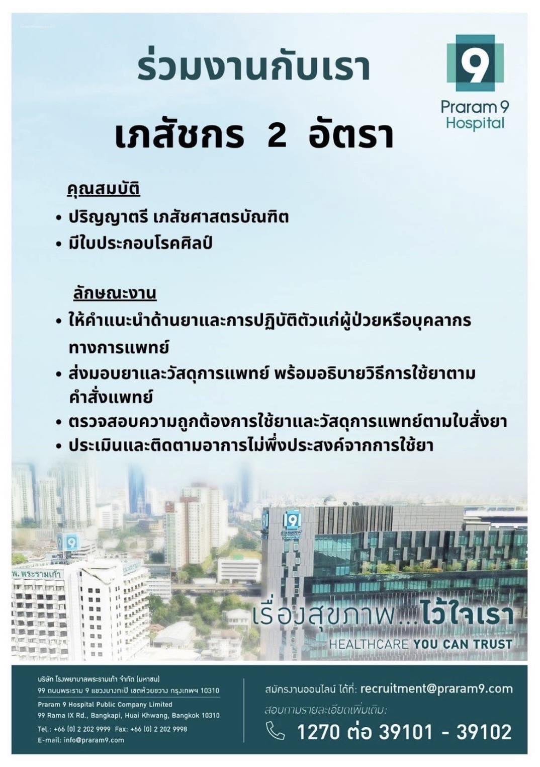 สมัครงานออนไลน์ ได้ที่: recruitment@praram9.com