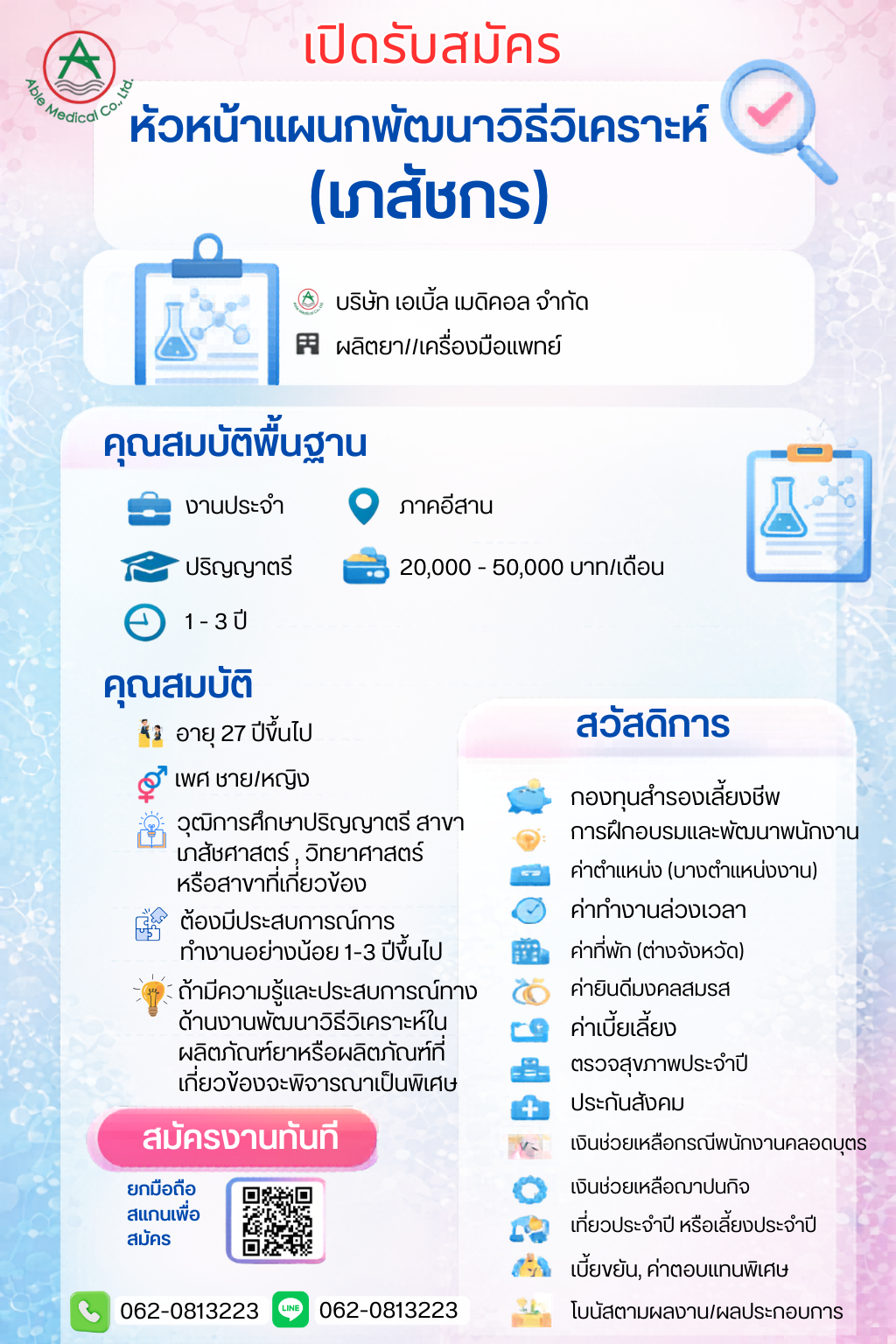 *ถ้ามีความรู้และประสบการณ์ทางด้านงานพัฒนาวิธีวิเคราะห์ในผลิตภัณฑ์ยาหรือผลิตภัณฑ์ที่เกี่ยวข้องจะพิจารณาเป็นพิเศษ