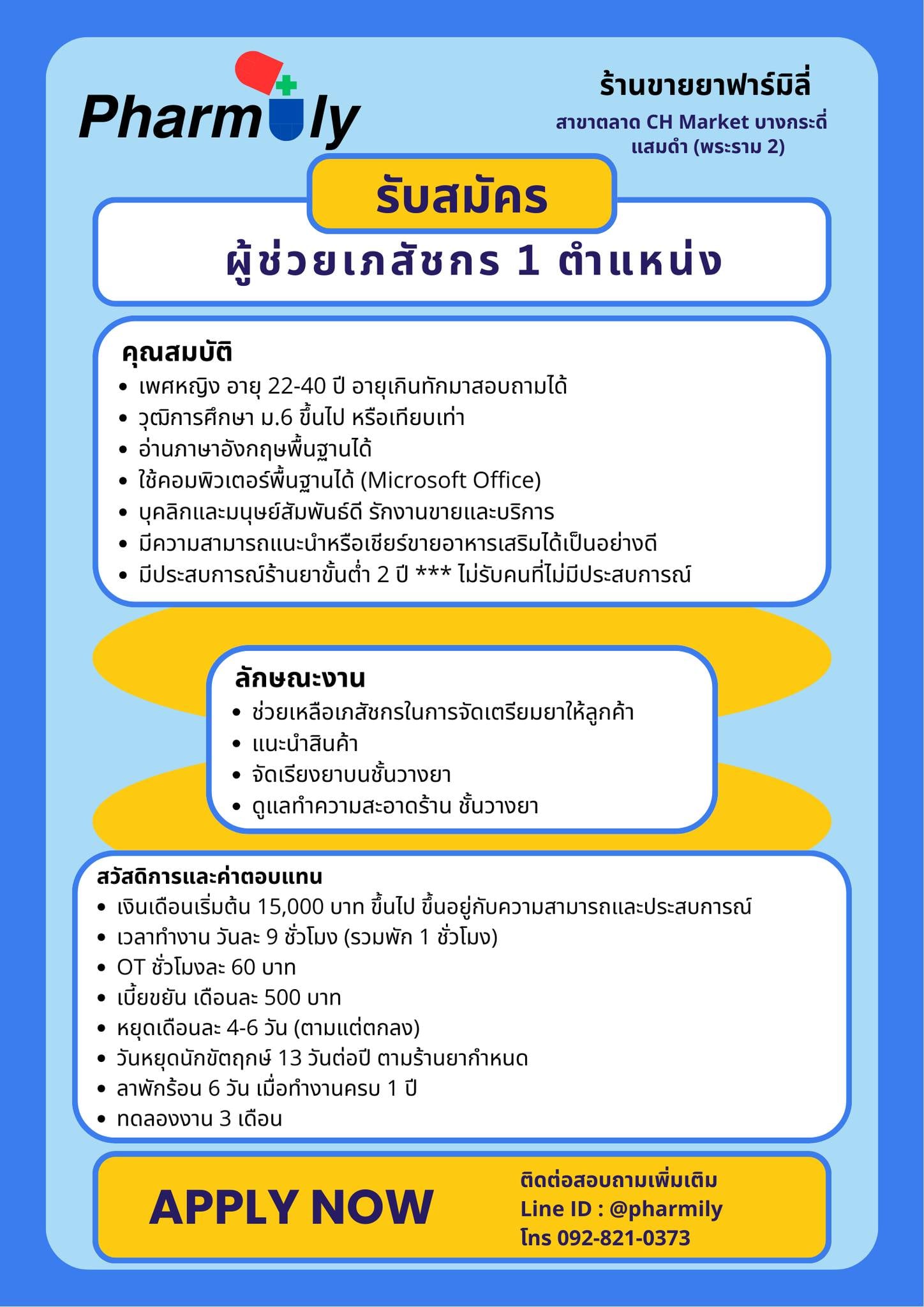เวลาทำงาน : 12.00 – 21.00 น. (รวมเวลาพัก)